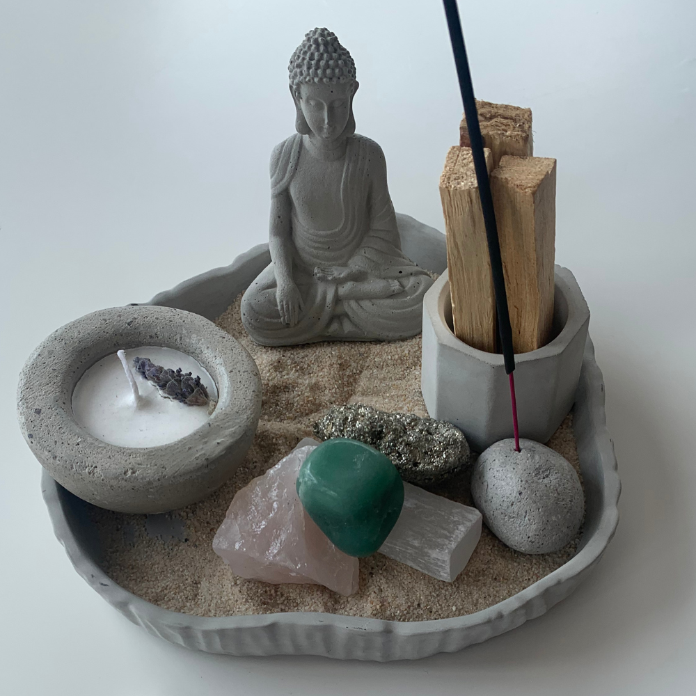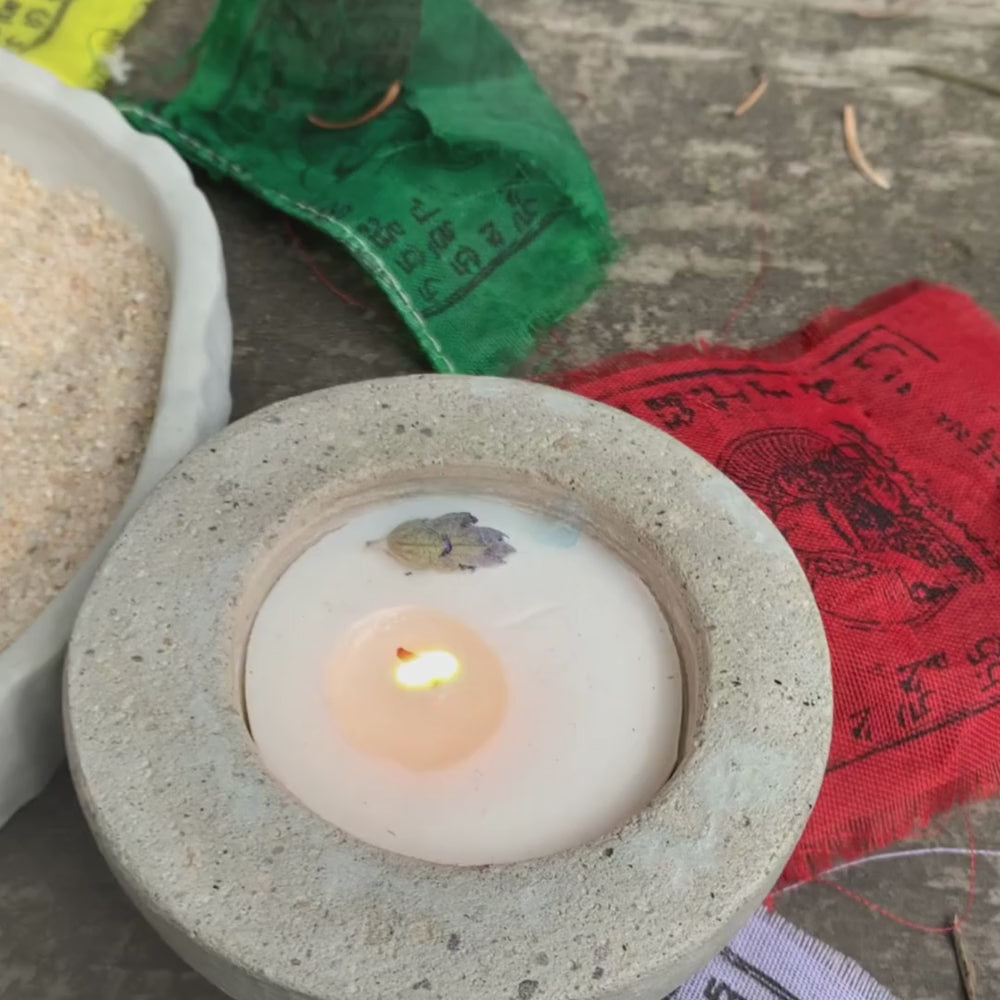 - Vela de soya (lavanda) con base de concreto: Enciende la vela y crea una atmósfera relajante para tu meditación.